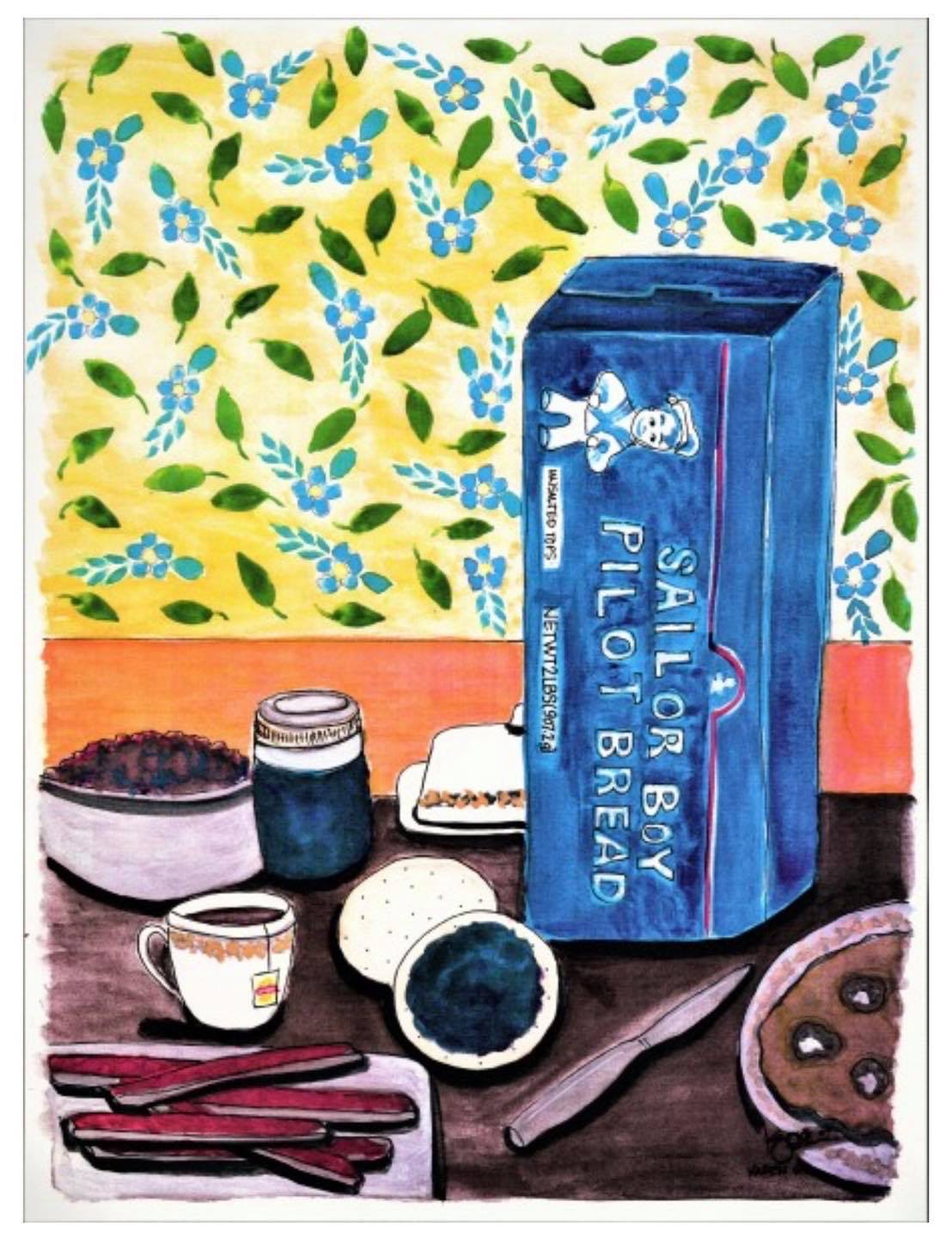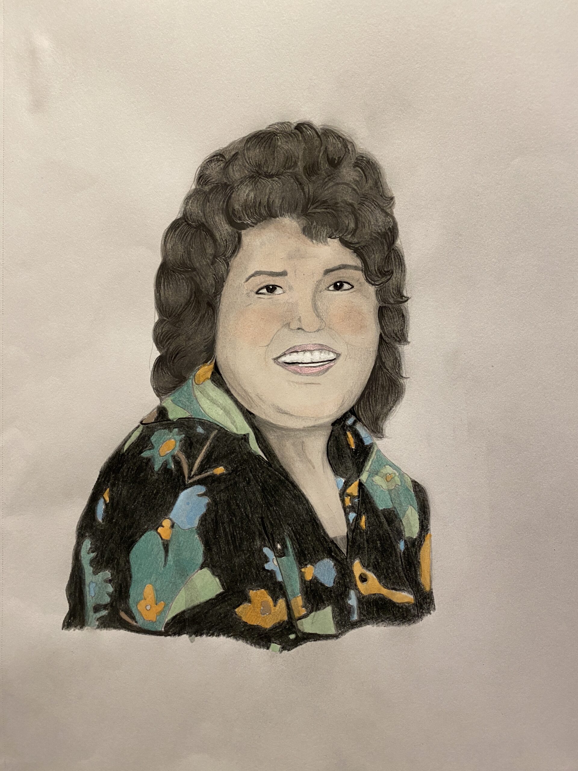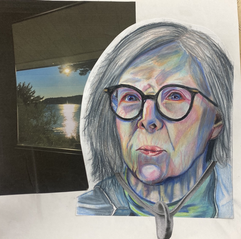 “This is a colored pencil piece of my great-grandmother, Laura. I added a cut-out photo of the view from her home on Kodiak Island where I have stayed during my many visits. I also glued on a cut-out of her necklace that I wear nearly every day, taken from my own senior photo. Laura was the daughter of Dora Ursin, who was an original Shareholder of CIRI. I never had the privilege of meeting her, but I have heard many stories through my grandmother Laura.”