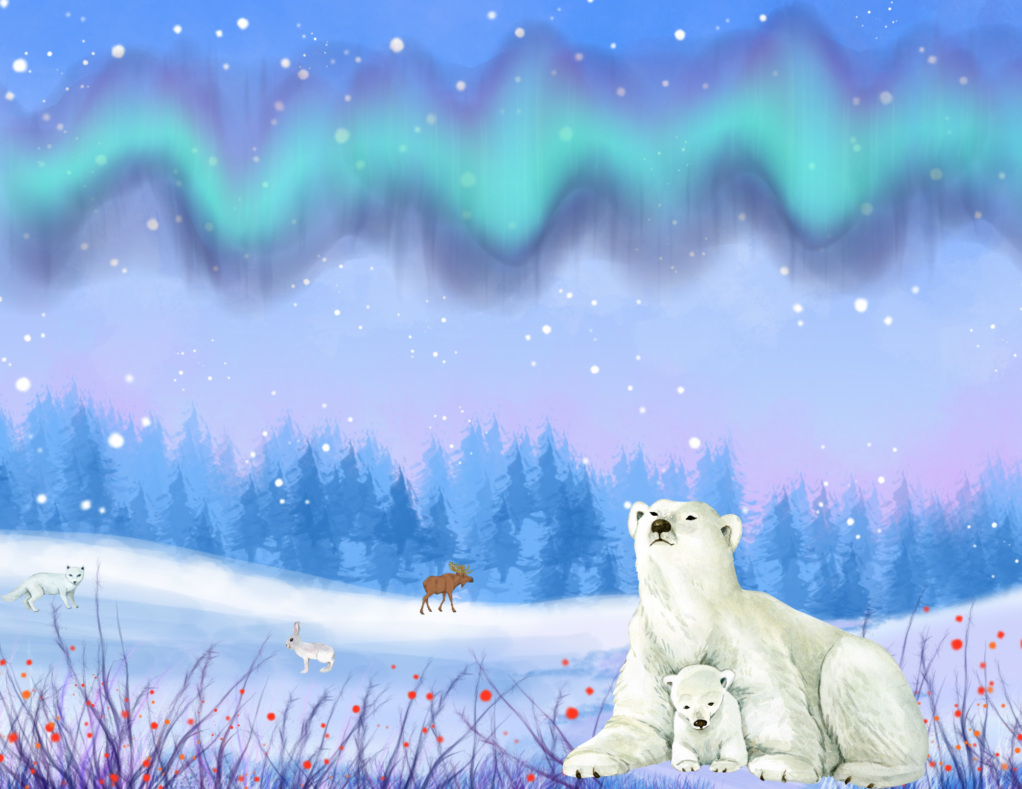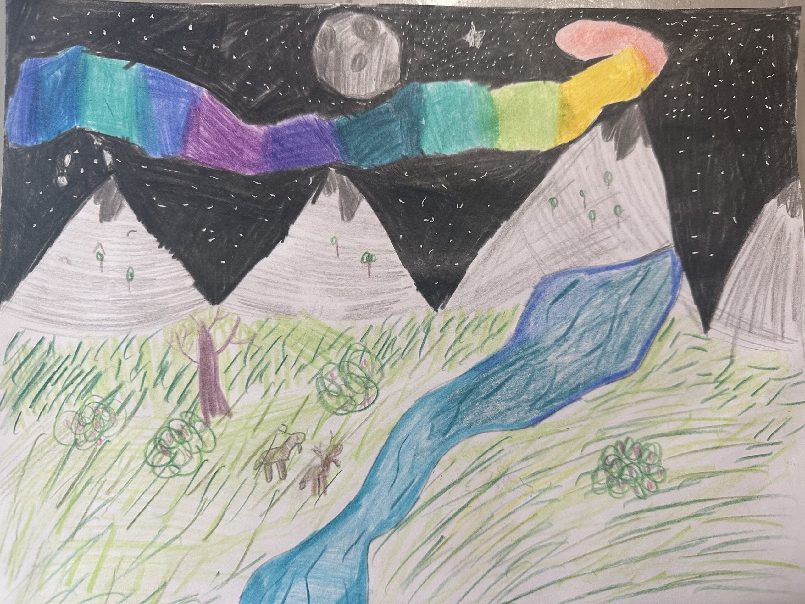 “My artwork is of the northern lights and nature in Alaska. There are two moose and berry bushes and a stream and there are mountains and lots of stars in the sky.”