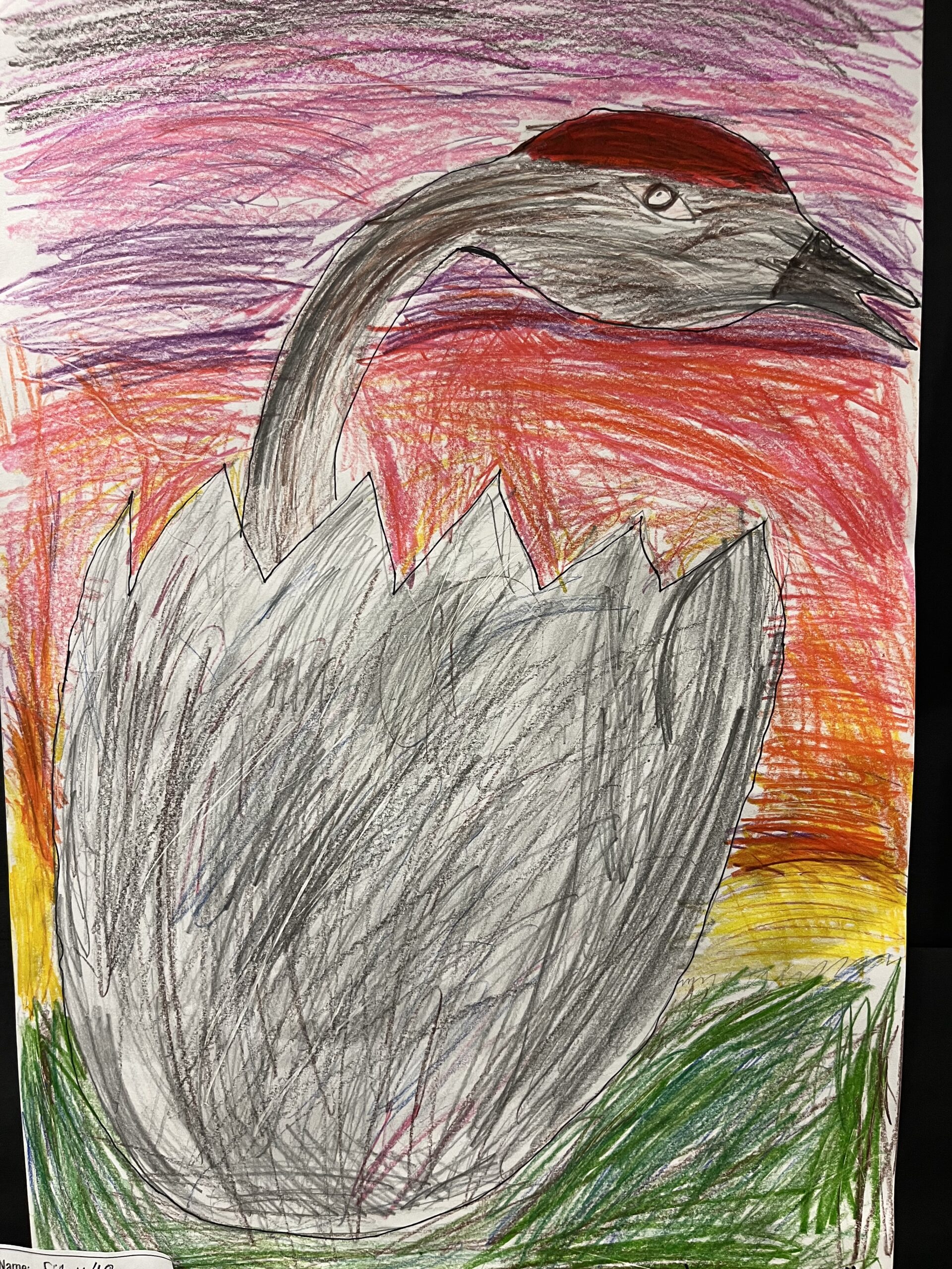 “Every year a sandhill crane family comes to our house. They stay during the summer and lay their eggs. Sandhill cranes always stay with their family, and they remind me of mine. I drew a baby sandhill crane with a sunset behind it.”